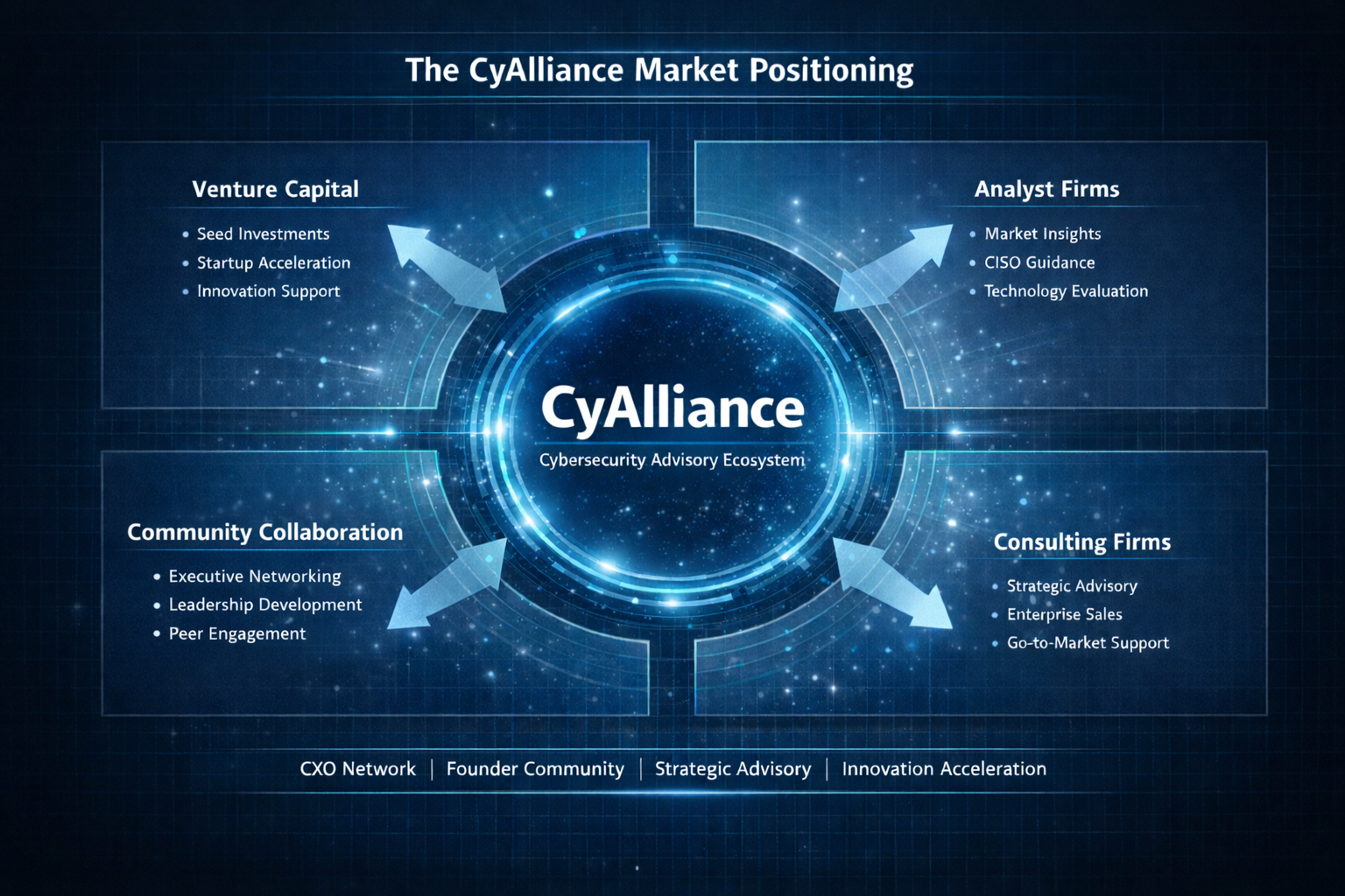 We are a Cybersecurity Advisory and Executive Ecosystem connecting innovators with the CISOs and Technology leaders shaping the future of cyber. We provide strategic guidance, portfolio support, and trusted advisory to accelerate innovation and enterprise adoption.